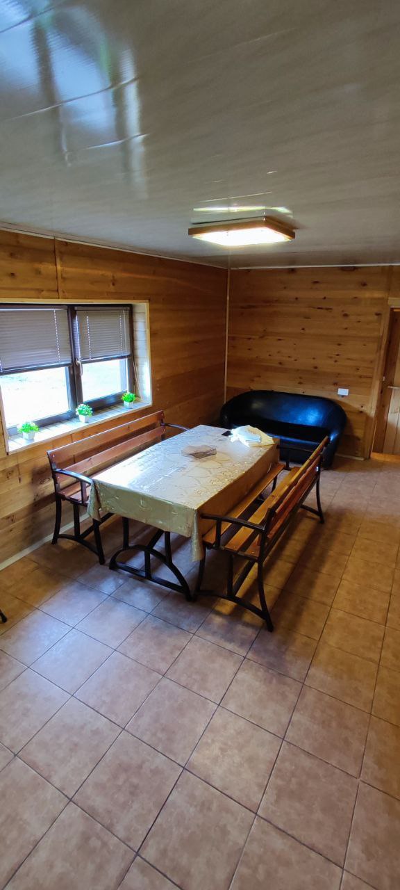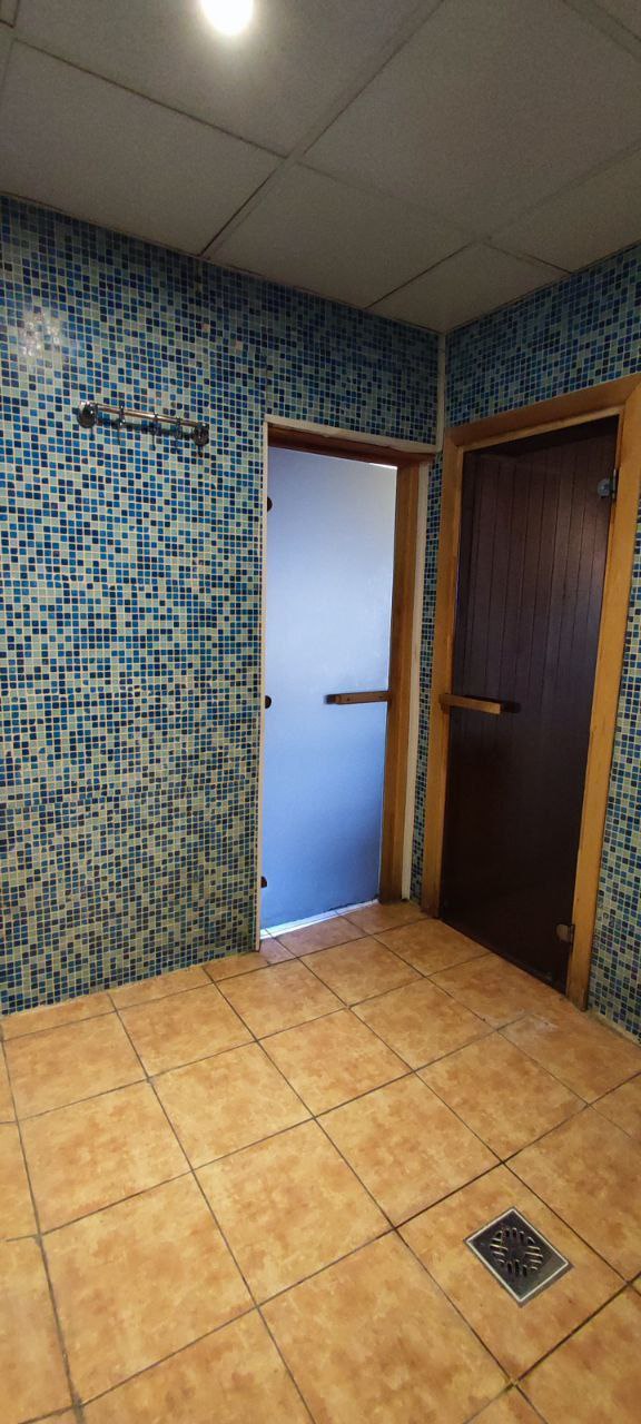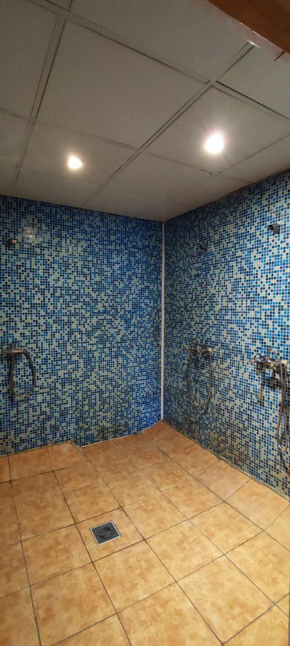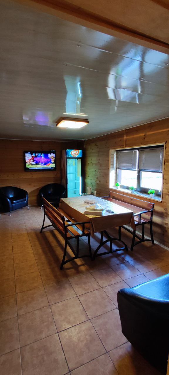Просторный душ, комната отдыха с мягкой мебелью и большим столом для дружеских посиделок.