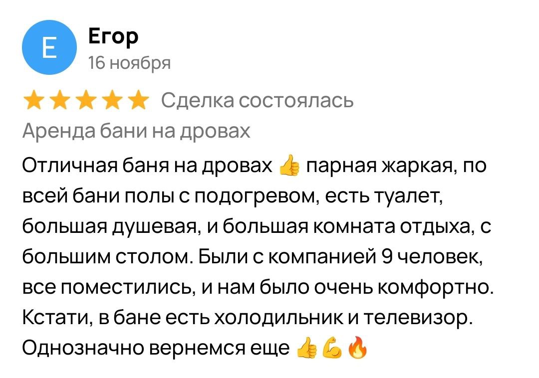 Баня доступна для бронирования в любое время: утром, днём, вечером, в будни, выходные и праздничные дни. Bы сами выбираете, когда хочется восстановить силы - после рабочей недели, перед праздником или просто для приятного времяпрепровождения. Гибкий график позволяет отдыхать тогда, когда удобно именно вам.